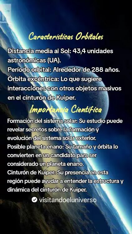 Caracteristicas orbitales: Este objeto o planeta enano, esta a una distancia de 43,4 Unidades Astronomicas de media de nuestro Sol. Su periodo orbital es de alrededor de 288 años, tiene una orbita excentrica, lo que sugiere interraciones con otros objetos masivos en el cinturon de Kuiper.