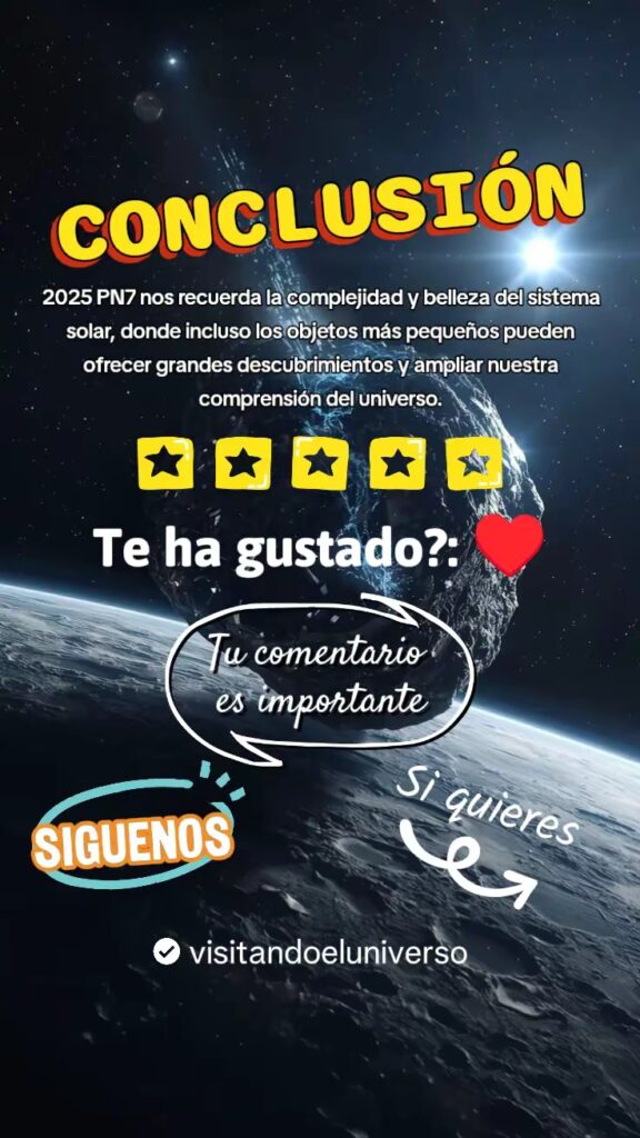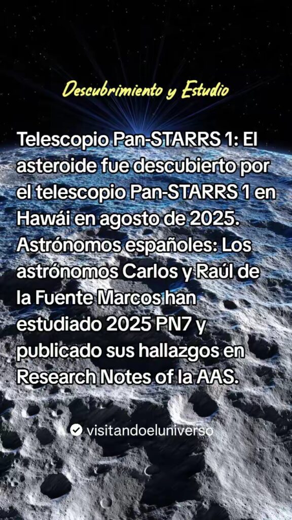 Descubrimiento y estudio: El telescopio Pan-STARRS1, fue el que descubrio este asteroide desde su ubicacion en Hawai en agosto de 2025. Los astronomos españoles «Carlos y Raul de la fuente» han estudiado a 2025 PN7 y publicado sus hallazgos en lugares como, «Research Notes of la AAS«.