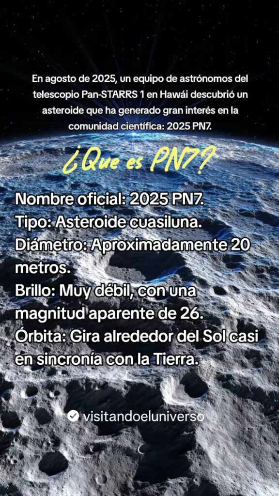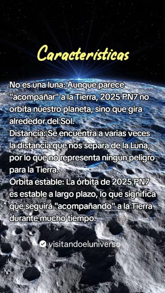 ¿Que es 2025 PN7?: Su nombre oficial es 2025 PN7. No es una Luna, aunque al parecer acompaña a la Tierra, no orbita nuestro planeta, si no que gira alrededor de el SOL. Se encuentra a una distancia, varias veces la distancia que nos separa de la Luna a si que no representa ningun peligro para la Tierra. Tiene una orbita estable a largo plazo, lo que significa que seguira acompañando a la tierra durante miles de años.