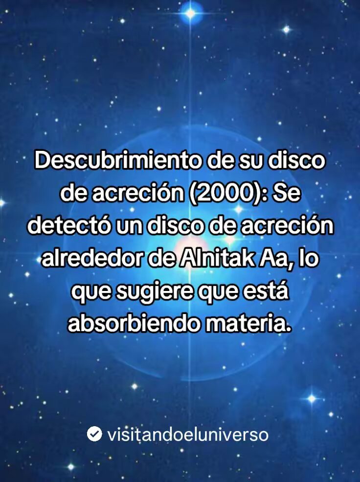 Su disco de acreción se descubrió en el año 2.000 en el cual se detecto un disco de acreción alrededor de ALNITAK Aa, lo que sugiere que esta absorbiendo materia. En el 2010 algunos estudios de los astrónomos sobre Alnitak Aa descubrieron que esta estrella supergigante esta en el final de sus tiempos.