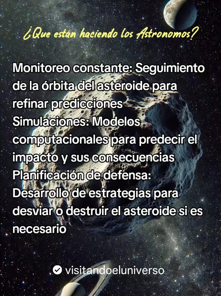 Hay un monitoreo constante de este asteroide, seguimiento de su orbita para refinar predicciones. También se están realizando modelos computacionales para predecir el impacto y sus consecuencias, con ello se planifica una defensa en el desarrollo de estrategias para desviar o destruir el asteroide si fuera necesario.
