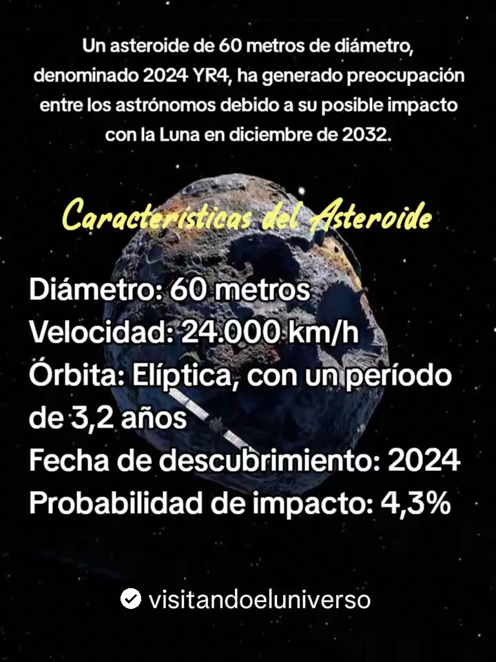 Un asteroide de un tamaño de 60 metros de diámetro, denominado 2024 YR4, ha generado bastante preocupación entre los astrónomos debido a su posible impacto con la Luna en diciembre de 2032.