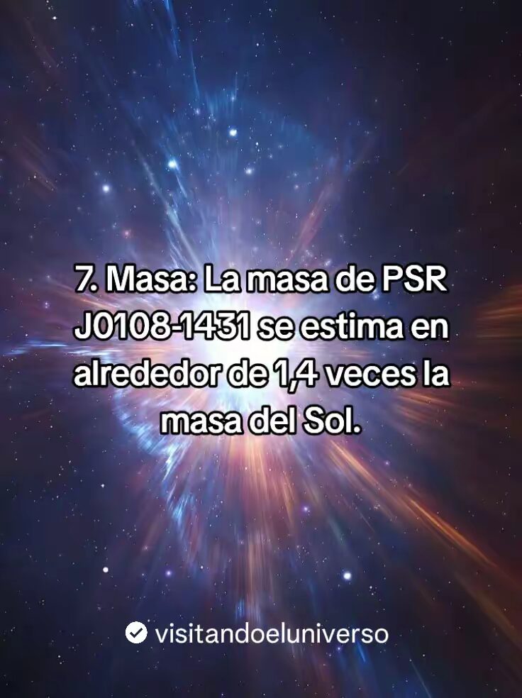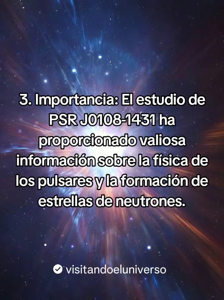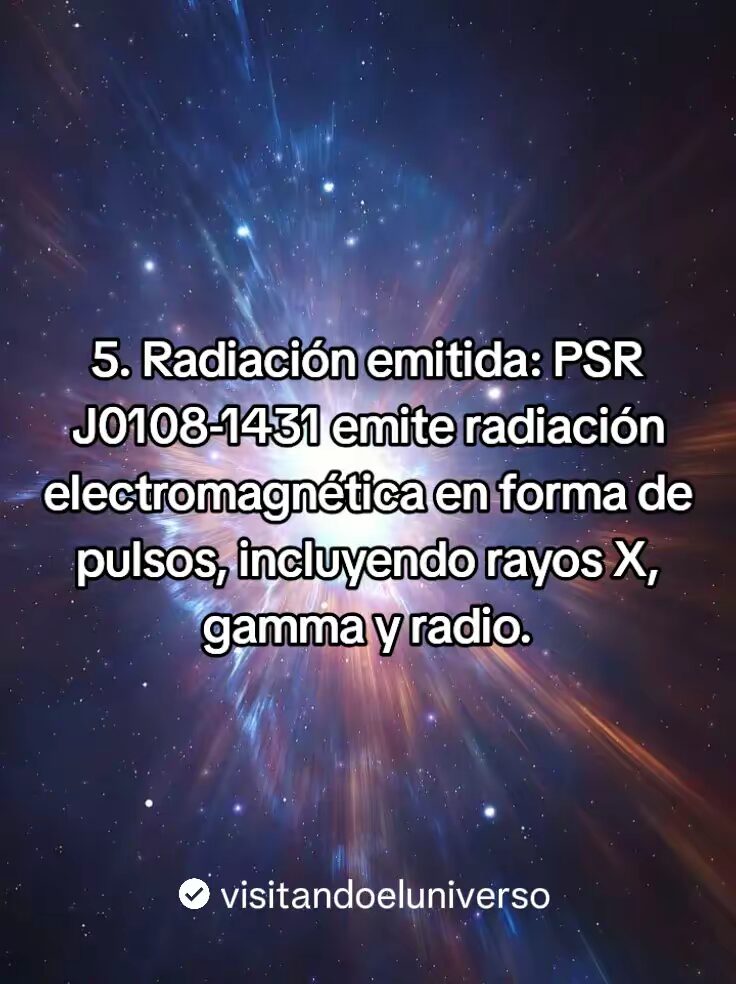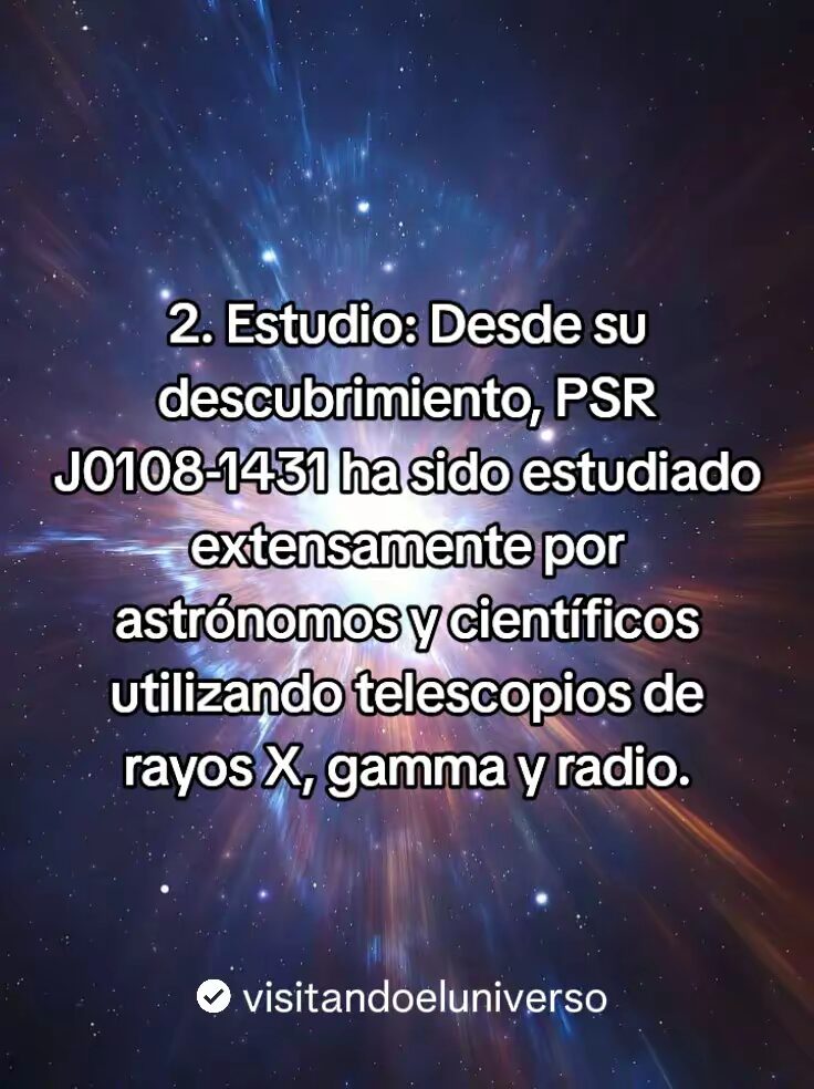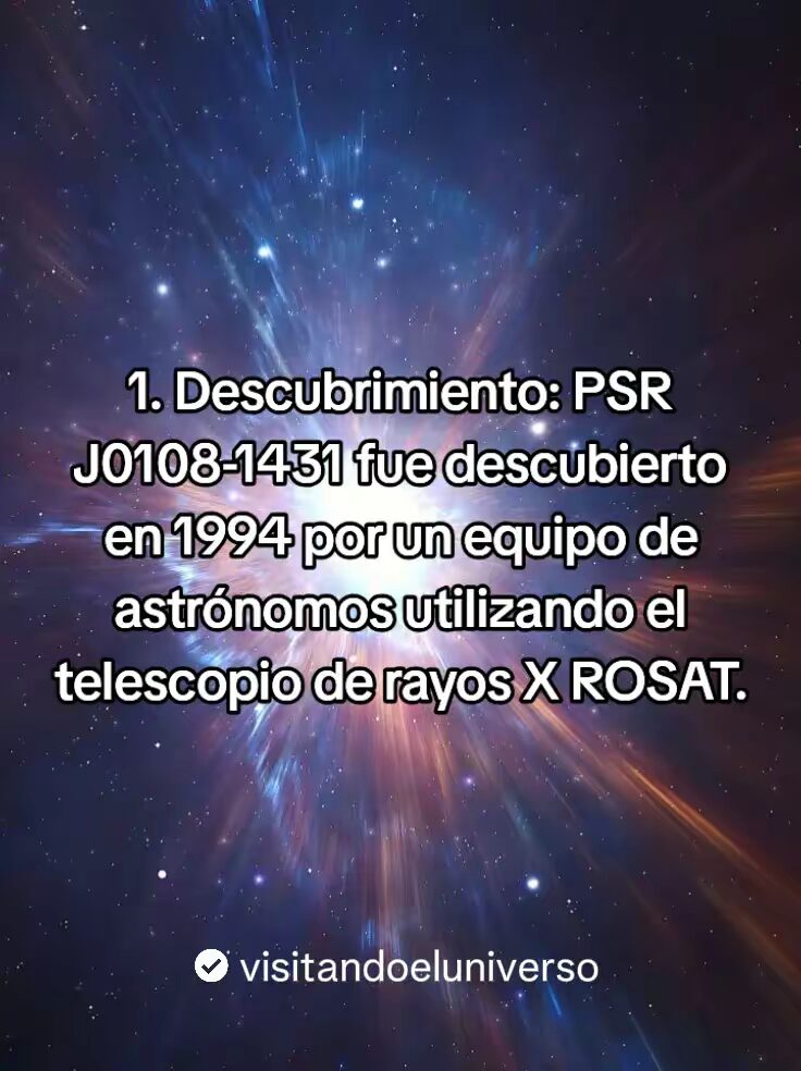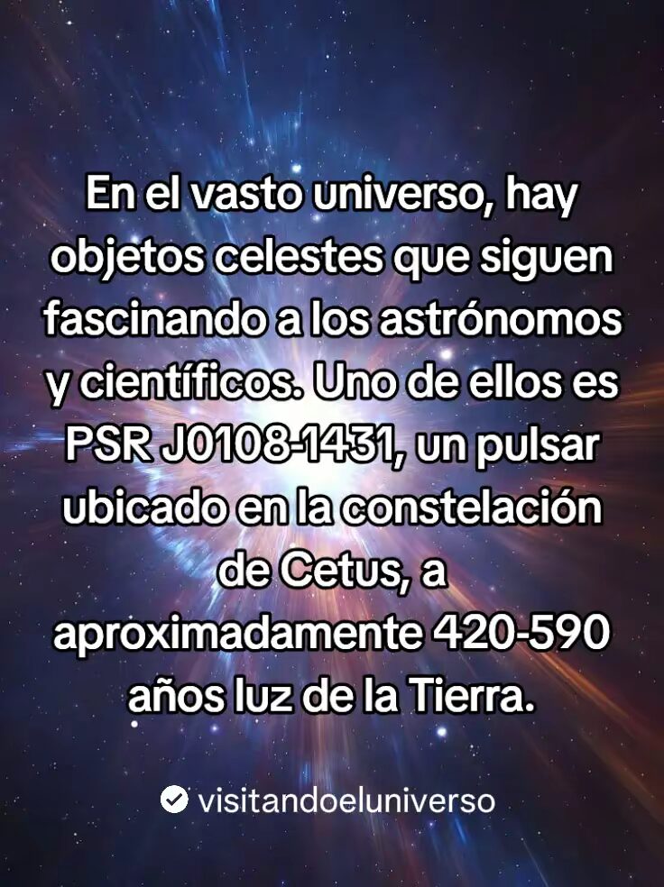 PSR J0108-1431 Es el pulsar mas cercano a la tierra, en el vasto universo hay objetos celestes que siguen deleitando a los astrónomos y científicos de todo el mundo. Uno de ellos es este. Un pulsar ubicado en la constelación de Cetus, aproximadamente entre 420 años luz y 590 años luz de distancia de la tierra.