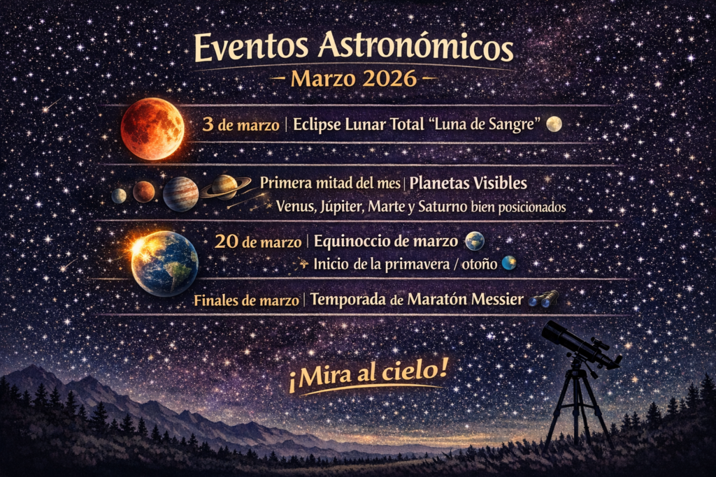 Marzo de 2026 será uno de los meses más interesantes del año para la observación astronómica, con fenómenos que van desde un eclipse lunar total hasta cambios estacionales y buenas oportunidades para ver planetas. A continuación tienes un artículo completo con todos los eventos destacados y consejos para disfrutarlos.