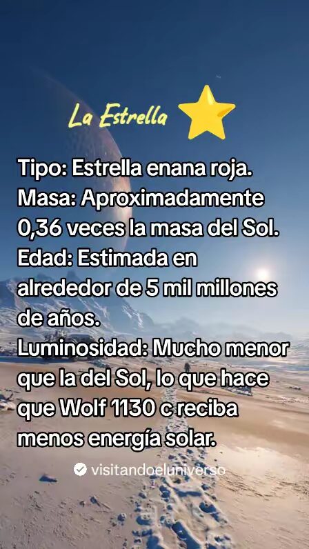 ¿Que es Wolf 1130 c?: Su nombre oficial como bien indicamos es Wolf 1130c, un tipo de exoplaneta terrestre (parecido a la tierra). Esta ubicado en la orbita de la estrella Wolf 1130, una estrella enana roja ubicada a proximadamente 53,5años luz de la tierra. Fue descubierto en 2017 por un equipo de astronomos utilizando el telescopio HARPS en Chile.