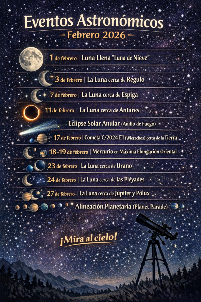 Febrero de 2026 nos recuerda que el cielo siempre tiene algo que ofrecer. Con fenómenos espectaculares y otros más sutiles, es un mes ideal para planificar observaciones, aprender a reconocer constelaciones y disfrutar del universo.