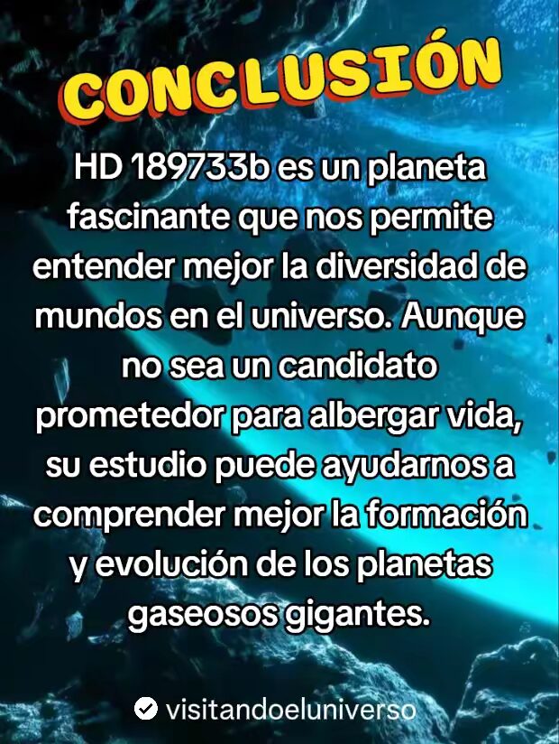 Conclusion: El Planeta Azul HD 189733b es un planeta misterioso, el cual nos permite entender mejor la diversidad de mundos en el universos. Aunque no sea un candidato prometedor para albergar vida en su interior, su estudio puede ayudarnos a comprender mejor la formación y evolución de los planetas gaseosos gigantes.