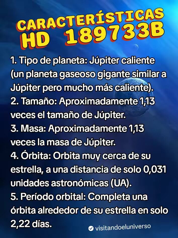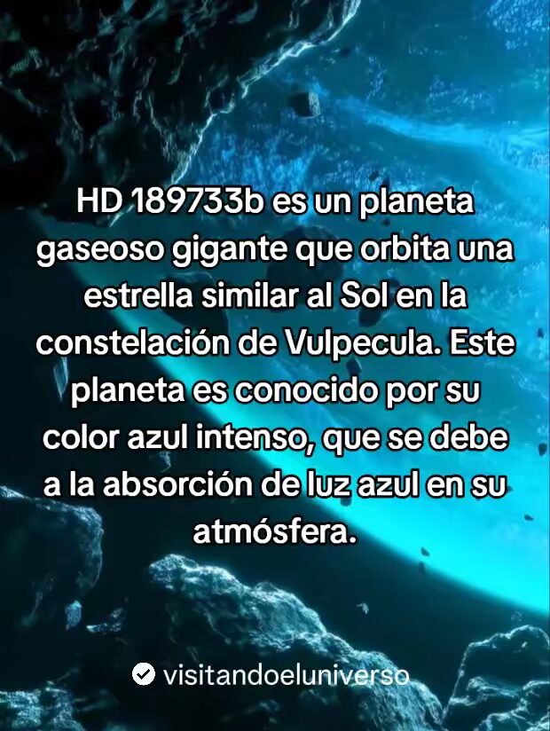 Un planeta gaseoso con condiciones extremas, HD 189733b se considera un gigante gaseoso que orbita una estrella similar al SOL en la constelación de Vulpecula. Este planeta es conocido por su color Azul intenso, el cual se debe a la absorción de luz azul en su atmosfera.