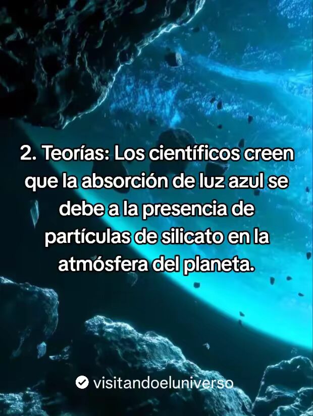 - Algunos científicos sugieren que la absorción de luz azul se debe a la presencia de partículas de Silicatos en la atmosfera del planeta.