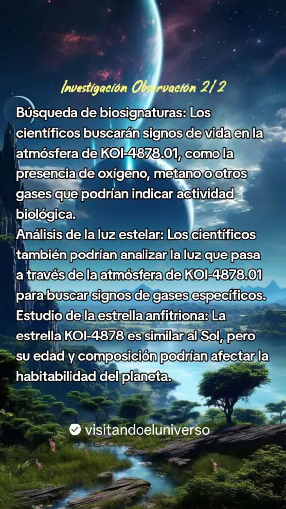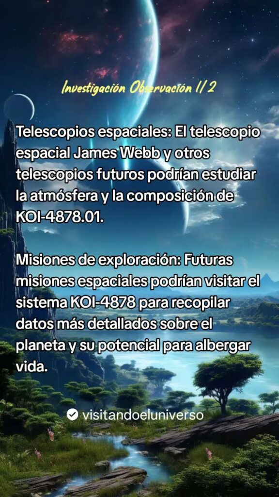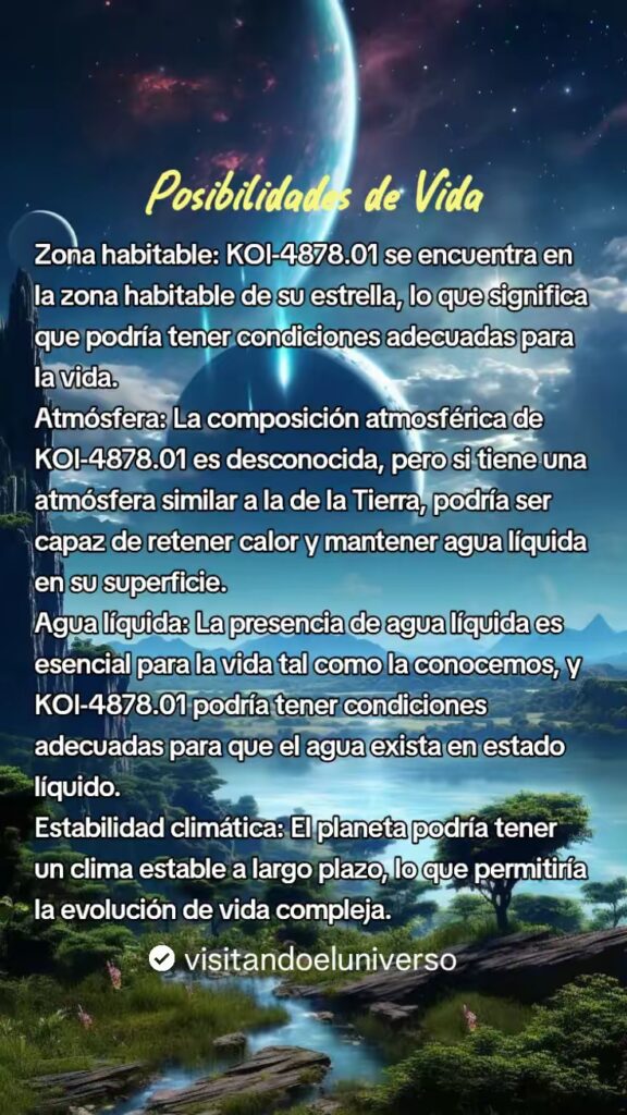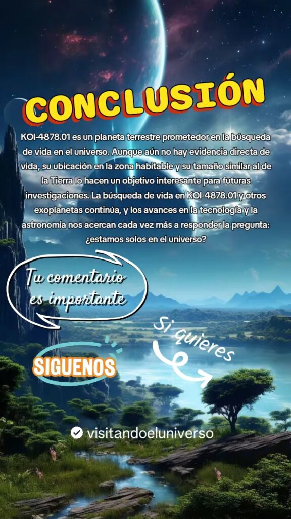 Conclusion: KOI-4878.01 es un planeta terrestre muy prometedor en la bussqueda de la vida en otros planetas que vagan por el cosmos. Aunque todavia no hay evidencia directa de vida en el. Es un objeto mui importante para la ciencia.