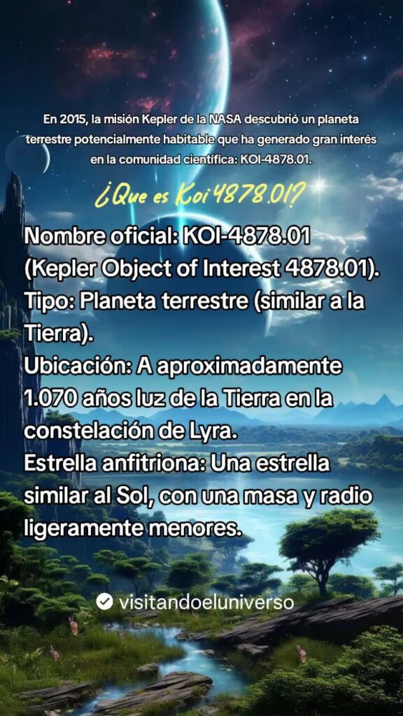 ¿Que es KOI 4878.01?: Su nombre oficial (Kepler Object of Interest 4878.01). Es un tipo de planeta terrestre, similar al planeta tierra. Esta ubicado a 1.070 años luz de distancia aproximadamente en la constelacion de Lyra. La estrella que orbita, es una estrella similar al Sol, con una masa y radio ligeramente menores.