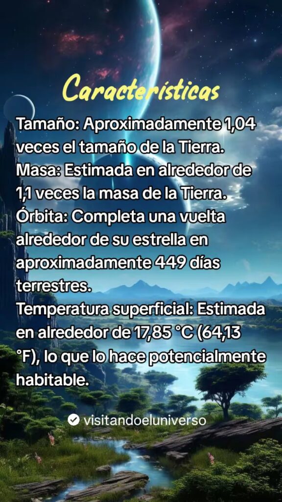 Posibilidades de vida: Se encuentra en la zona habitable de su estrella, lo que significa que podria tener condiciones adecuadas para la vida. La composicion de su atmosfera es similar a la de nuestro planeta, lo que seria capaz de retener calor y mantener agua liquida en su superficie.