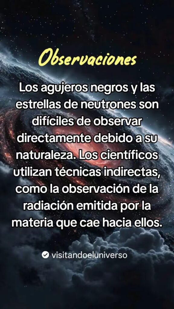 - Los agujeros negros y las estrellas de neutrones son dificiles de observar directamente debido a su naturaleza. Los cientificos utilizan tecnicas indirectas, como la observacion de la radiacion emitida por la materia que cae hacia ellos.