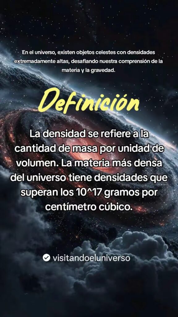 - La densidad se refiere a la cantidad de masa por unidad de volumen, es decir que la materia mas densa del universo tiene densidades que superan los 10^17 gramos por centimetro cubico.