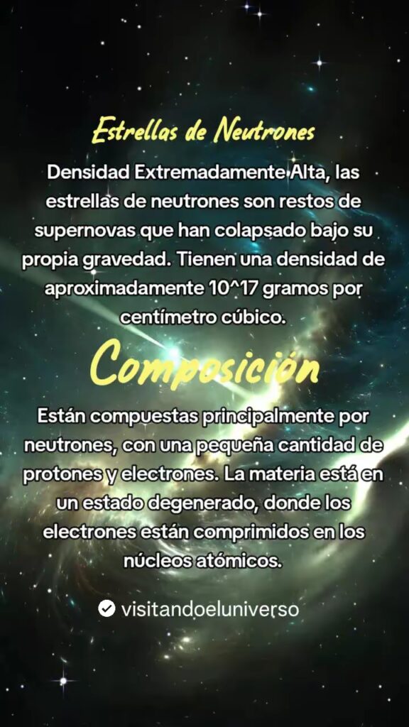 - La composicion de las estrellas de neutrones, tienen una pequeña cantidad de protones y electrones. La materia esta en un estado degenerado, donde los electrones estan comprimidos en nucleos atomicos.