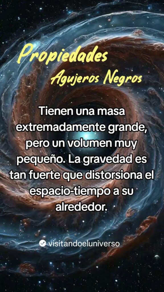 - Las propiedades de los agujeros negros, tienen una masa extremadamente grande, pero un volumen muy pequeño. La gravedad es tan fuerte que distorsionan el espacio-tiempo a su alrededor.