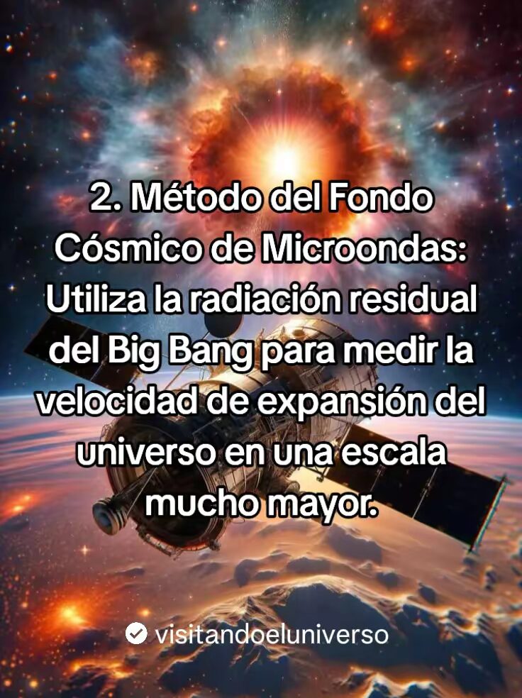 - El método del Fondo Cósmico de microondas, el cual utiliza radiación residual del Big Bang para medir la a velocidad de expansion del universo en una escala mucho mayor.