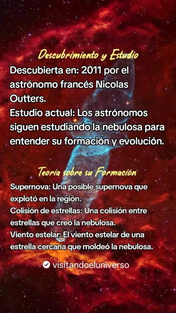 Descubrimiento y estudio: Fue descubierta en el año 2011 por el astronomo frances «Nicolas Outters» el cual investigaba el cielo en una noche oscura con el cielo despejado. Actualmente los astronomos siguen estudiando la nebulosa para entender su formacion y evolucion.