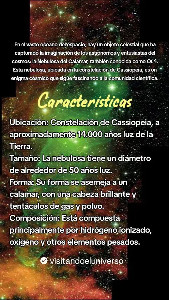 En el gran oceano cosmico, hay un objeto que ha capturado la imaginacion de los astronomos y entusiastas del cosmos, la nebulosa del calamar, tambien conocida como Ou4. Una nebulosa que ha fascinado a astronomos de todo el mundo por su forma parecida a la de un calamar y que sigue intrigando a investigadores del espacio.