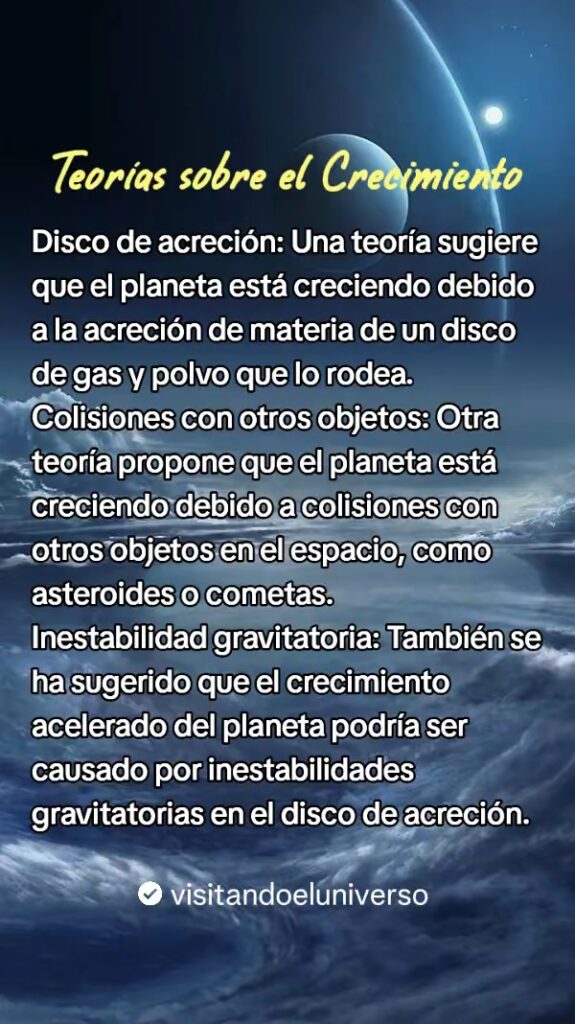 Teorias sobre su crecimiento: Una de las teorias sugiere que el planeta esta creciendo debido a la acrecion de materia de un disco de gas y polvo que le rodea. Otra de las teorias sugiere que el planeta crece debido a colisiones con otros objetos como «asteroides o cometas».