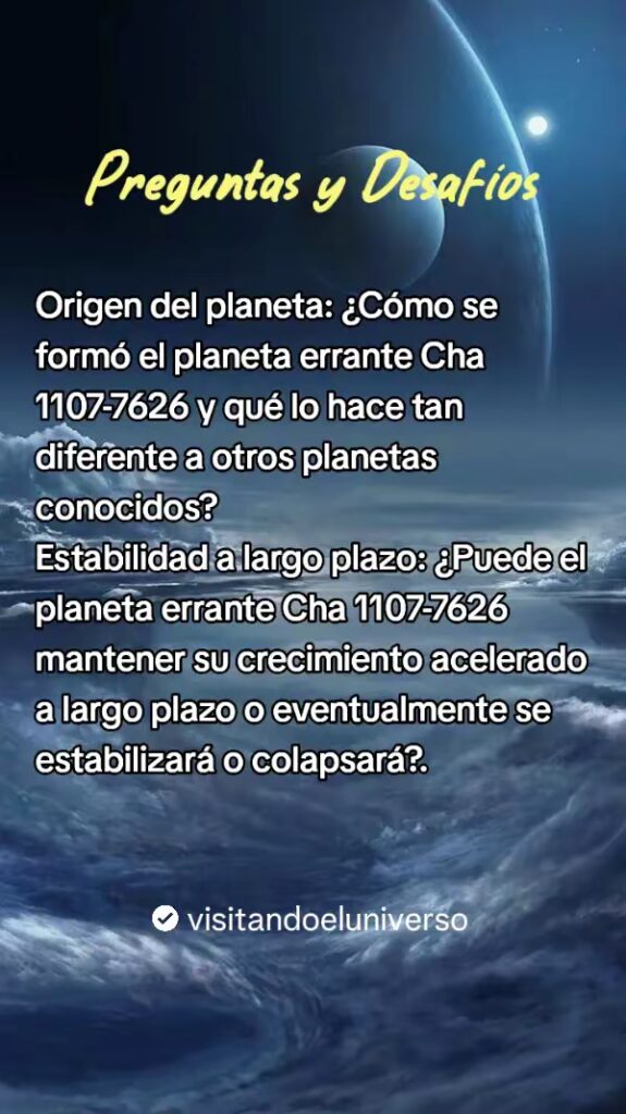 Preguntas y desafios: ¿Como se formo el planeta errante? ¿Que lo hace tan diferente a otros planetas conocidos? ¿Puede el planeta errante Cha 1107-7626 seguir creciendo a largo plazo o se estabilizara? Estas son algunas de las preguntas que me hago, ¿Podrias responder alguna de ellas?.