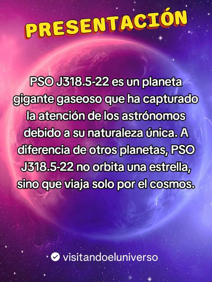 PSO J318.5-22 es un planeta gaseoso que viaja por el cosmos sin rumbo, sin estrella que le absorva hacia su trayectoria gravitacional. Es un planeta que ha fascinado a astrónomos debido a su naturaleza única. A diferencia de otros planetas, no orbita una estrella si no que viaja solo por el universo.