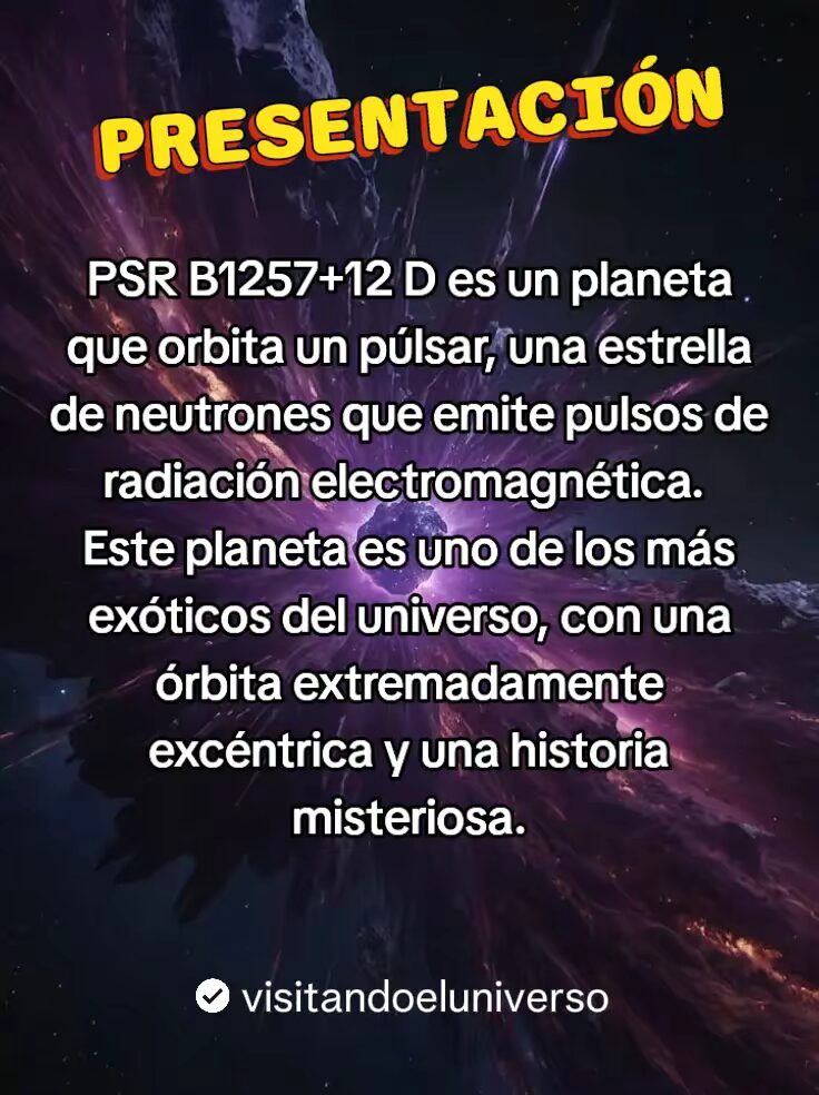 PSR 1257+12D es un Planeta el cual esta en la orbita de un pulsar, una estrella de neutrones que emite pulsos de radiación electromagnetica. Este planeta es uno de los mas llamativos del universo, ya que con una orbita extrema y excentrica cuenta una historia misteriosa.