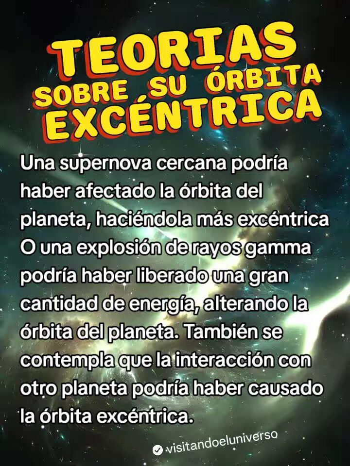 La supernova mas cercana podría haber afectado a la orbita del planeta, haciéndola mas excentrica o incluso una explosión de rayos gamma podría haber liberado una gran cantidad de energía, alterando asi la orbita del planeta. También se contempla que la interacción con otro planeta podría haber causado su orbita excentrica.