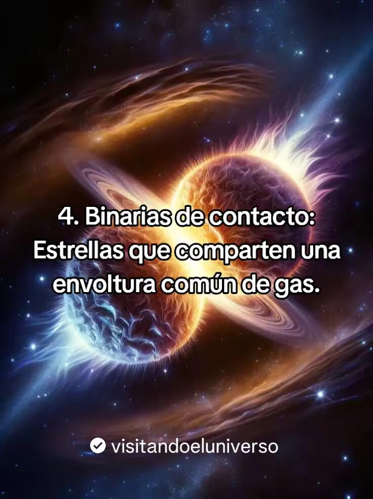 - Binarias de contacto: Estrellas que comparten una envoltura comun de gas.