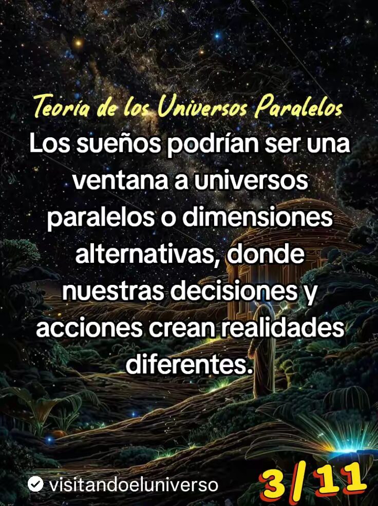 • La teoria de los universos paralelos, tambien dice que los sueños podrian ser una ventana a universos o dimensiones alternativas, donde nuestras decisiones y acciones crean realidades diferentes.