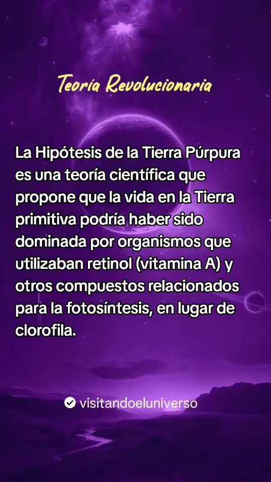 Una de las teorias mas revolucionarias sobre la evolucion de la vida en la tierra, es la teoria de la tierra purpura. La hipotesis cientifica que propone que la vida en la tierra primitiva podria haber sido dominada por organismos que utilizaban retinol (Vitamina A) y otros compuestos relacionados para la fotosintesis, en lugar de clorofila.