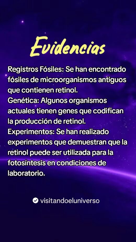 Evidencias que apoyan la hipotesis: Se han encontrado fosiles de microoganismos antiguos que contienen esta sustancia «Retinol«. Algunos organismos sactualess tienen genes que codifican la produccion de retinol. Se han realizado experimentos que demuestran que la retinol puede ser utilizada para la fotosintesis en condiciones de laboratorio.