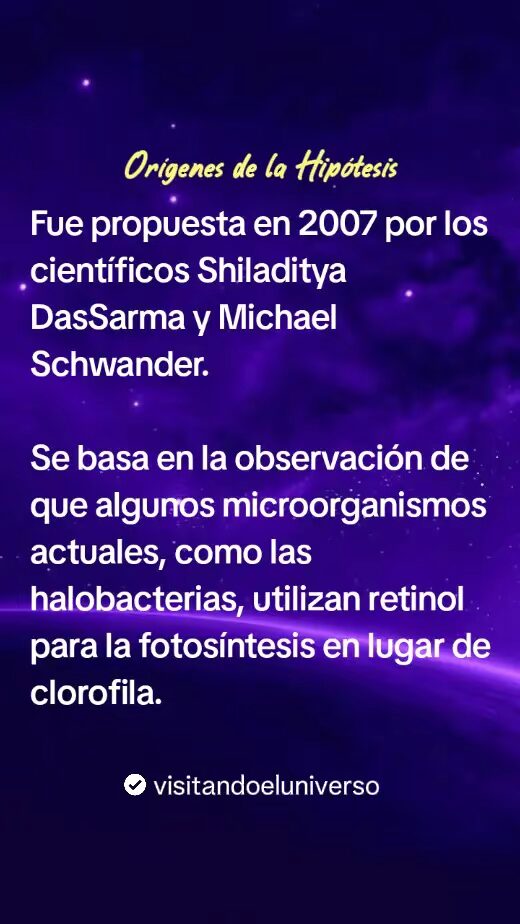Origenes de la hipotesis: En el año 2007 los cientificos «Shiladitya DasSarma y Michael Schwander«, propusieron esta hipotesis. Se basan en la observacion de algunoss microorganismos actuales como las halobacterias, que utilizan retinos para la fotosintesis en lugar de clorofila.