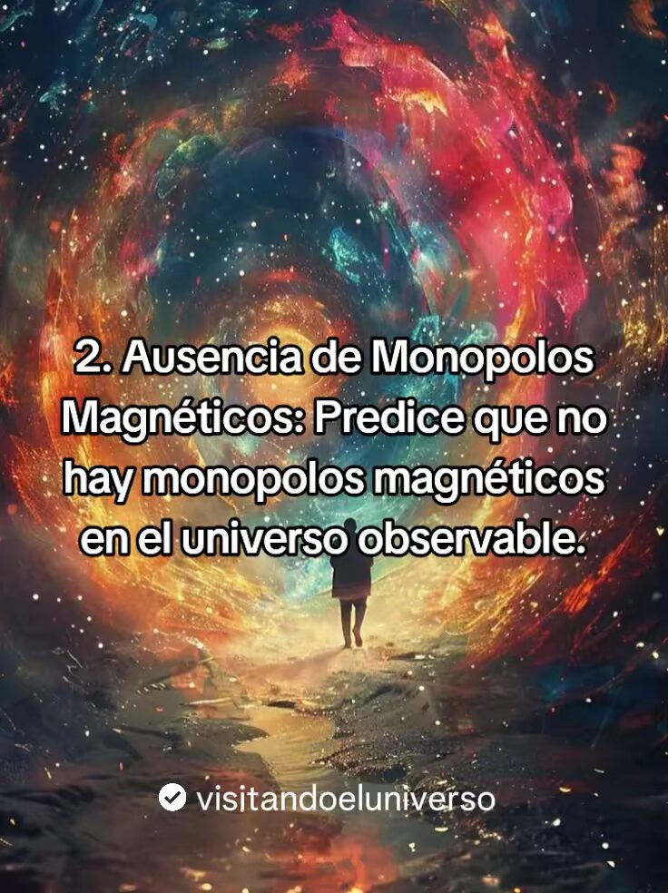 - La ausencia de monopolos magneticos, predice que no hay monopolos magneticos en el universo observable.
